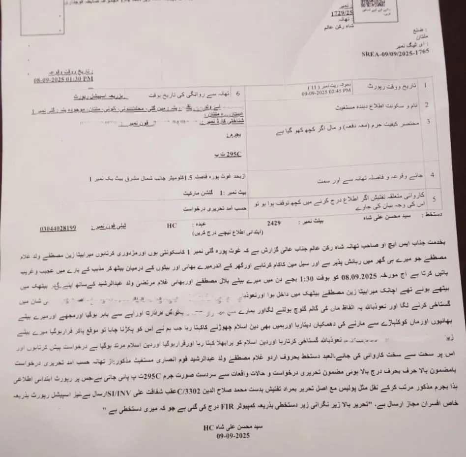 تھانہ شاہ رکن عالم توہینِ مذہب کرنے پر مقدمہ نمبر 1729/25 درج ہوا.