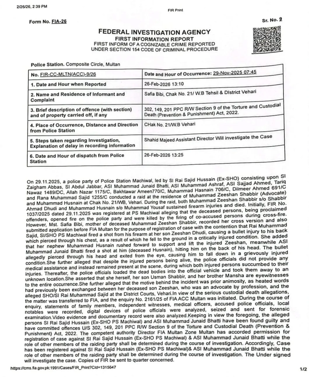 ایف آئی اے ملتان نے تقریباً 3 مہینے انکوائری کرنے کےبعد قتل کی نامزد ایف آئی آر 9/2026 درج کر لی.