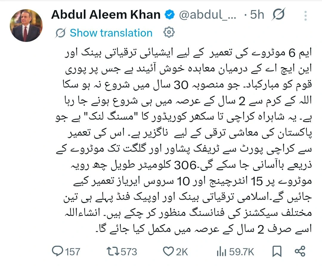 عبدالعلیم خان نے کہا کہ ایم سکس موٹروے کراچی تا سکھر کوریڈور کا ’مسنگ لنک‘ ہے جو معاشی ترقی کیلئے ناگزیر ہے، شاہراہ بننے سے ٹریفک کراچی پورٹ سے پشاور، گلگت تک موٹروے کے ذریعے باآسانی جاسکے گی، کراچی تا سکھر موٹروے ملکی تجارت اور سی پیک فریم ورک کا اہم ترین حصہ ہے۔