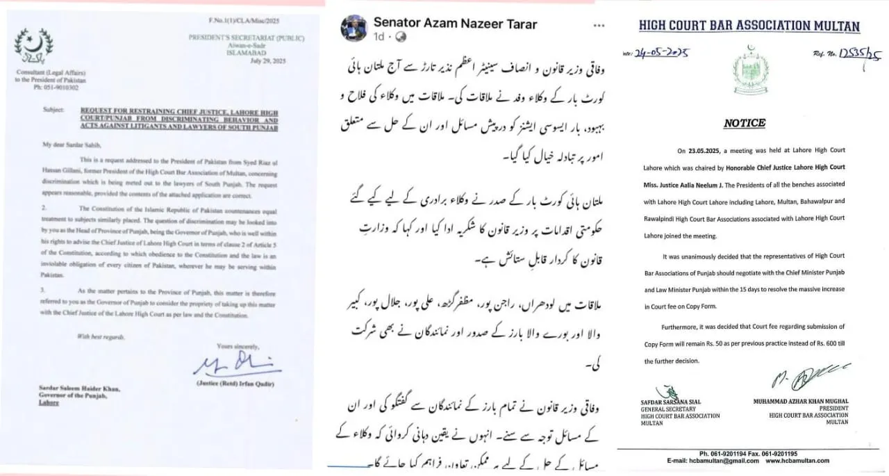 سابق صدر ہائیکورٹبار ایسوسی ایشن ملتان سید ریاض الحسن گیلانی کی جانب سے صدر ملکت کو لکھے گئے خط پر ایوان صدر کی جانب سے29 جولائی 2025ء کو گورنر پنجاب کو چیف جسٹس لاہور ہائیکورٹسے مشاورت کے ساتھ جنوبی پنجاب کے ساتھ امتیازی سلوک ختم کرانے اور دادرسی کرنے کی ہدایت کی گئی تھی.