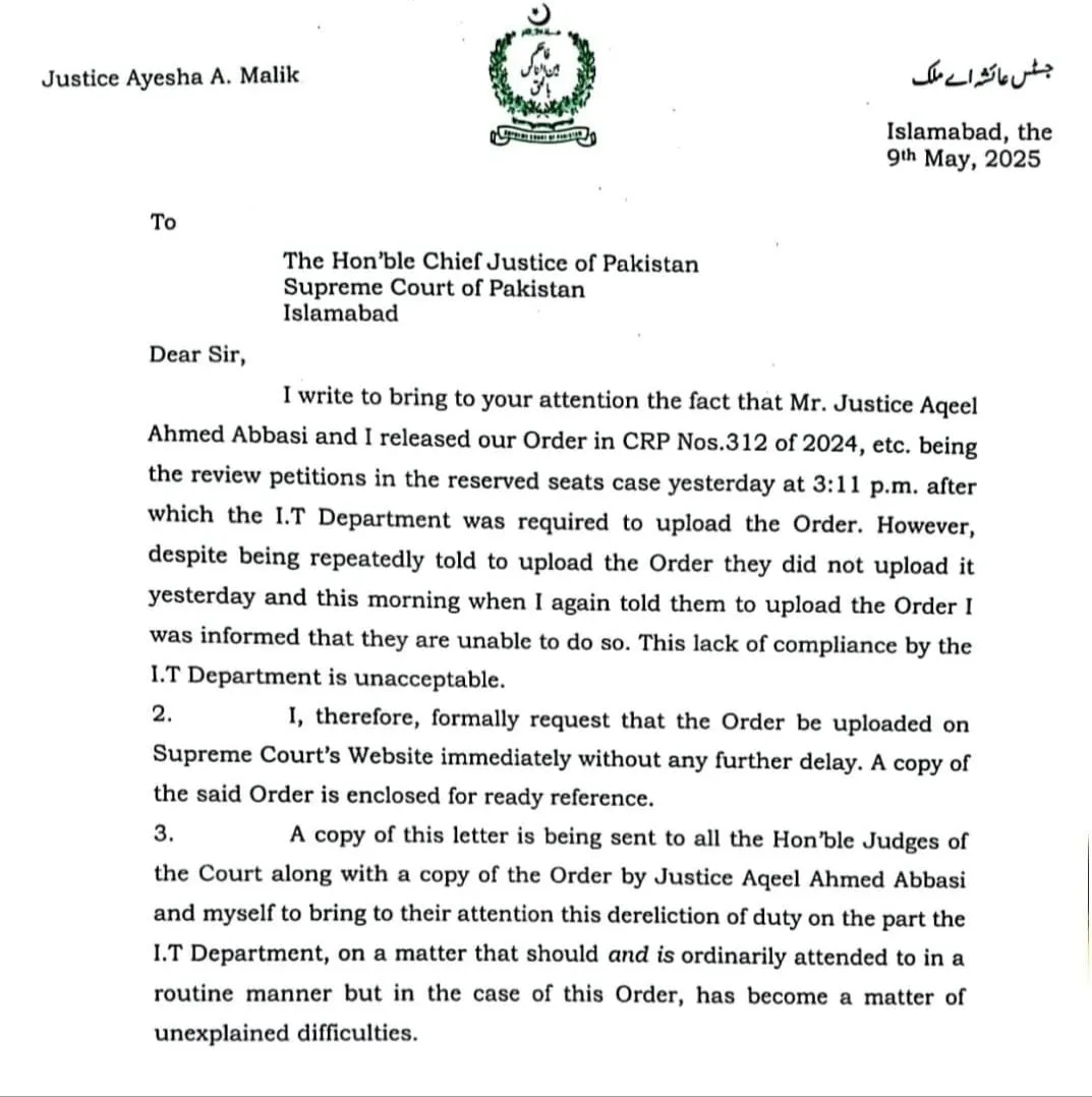 اس خط کی ایک کاپی عدالت کے تمام معزز جج صاحبان کو جسٹس عقیل احمد عباسی اور میری طرف سے حکم کی ایک کاپی کے ساتھ بھیجی جا رہی ہے تاکہ آئی ٹی ڈیپارٹمنٹ کی طرف سے فرائض میں اس غفلت کو ان کے نوٹس میں لایا جا سکے، ایک ایسا معاملہ جس پر معمول کے مطابق توجہ دی جانی چاہیے تھی لیکن اس حکم کے معاملے میں یہ غیر واضح مشکلات کا شکار ہو گیا ہے۔