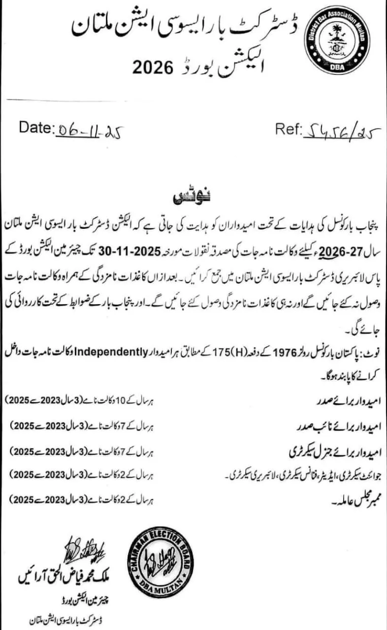 نوٹس میںکہا گیا ہے کہ پنجاب بار کونسل کی ہدایات کے تحت امیدواران کو ہدایت کی جاتی ہے کہ الیکشن ڈسٹرکٹ بار ایسوسی ایشن ملتان سال 27-2026 ء کیلئے وکالت نامہ جات کی مصدقہ نقولات مورخہ 2025-11-30 تک چیئر مین الیکشن بورڈ کے پاس لائبریری ڈسٹرکٹ بار ایسوسی ایشن ملتان میں جمع کرائیں۔