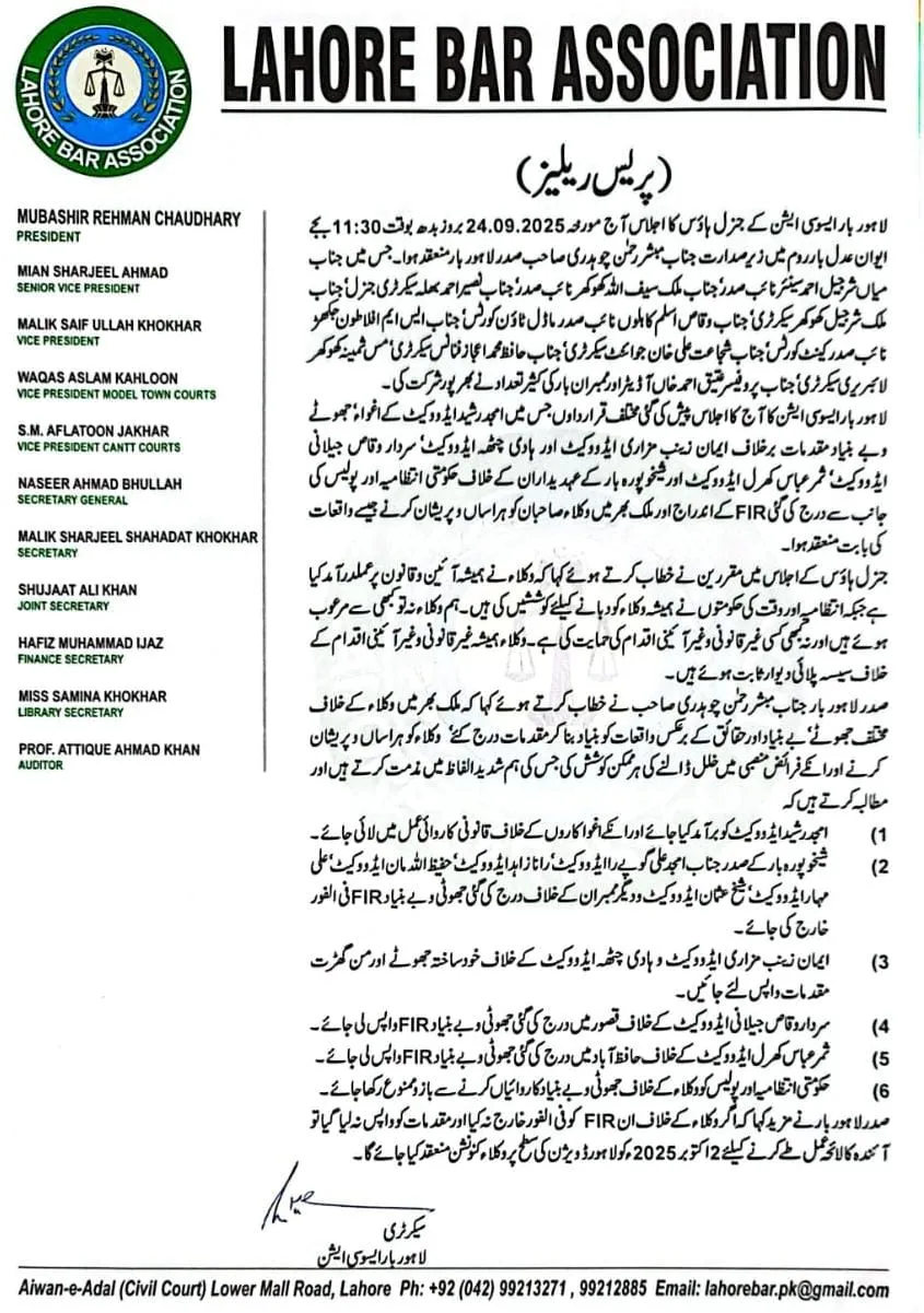 صدر لاہور بار نے مزید کہا کہ اگر وکلاء کے خلاف ان FIR کوفی الفور خارج نہ کیا اور مقدمات کو واپس نہ لیا گیا تو آئندہ کا لائحہ عمل طے کرنے کیلئے 2 اکتوبر 2025 ء کو لاہورڈ ویژن کی سطح پر وکلاء کنونشن منعقد کیا جائے گا۔