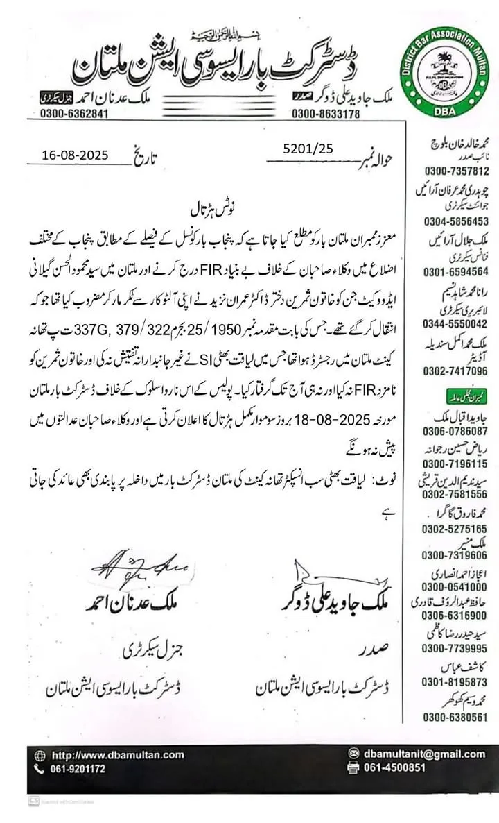 ڈسٹرکٹ بار ایسوسی ایشن ملتان کے صدر ملک جاوید علی ڈوگر اور جنرل سیکرٹری ملک عدنان احمد نے تحریری نوٹس بھی جاری کر دیا ہے.Untitled 2025 08 17T190304.854