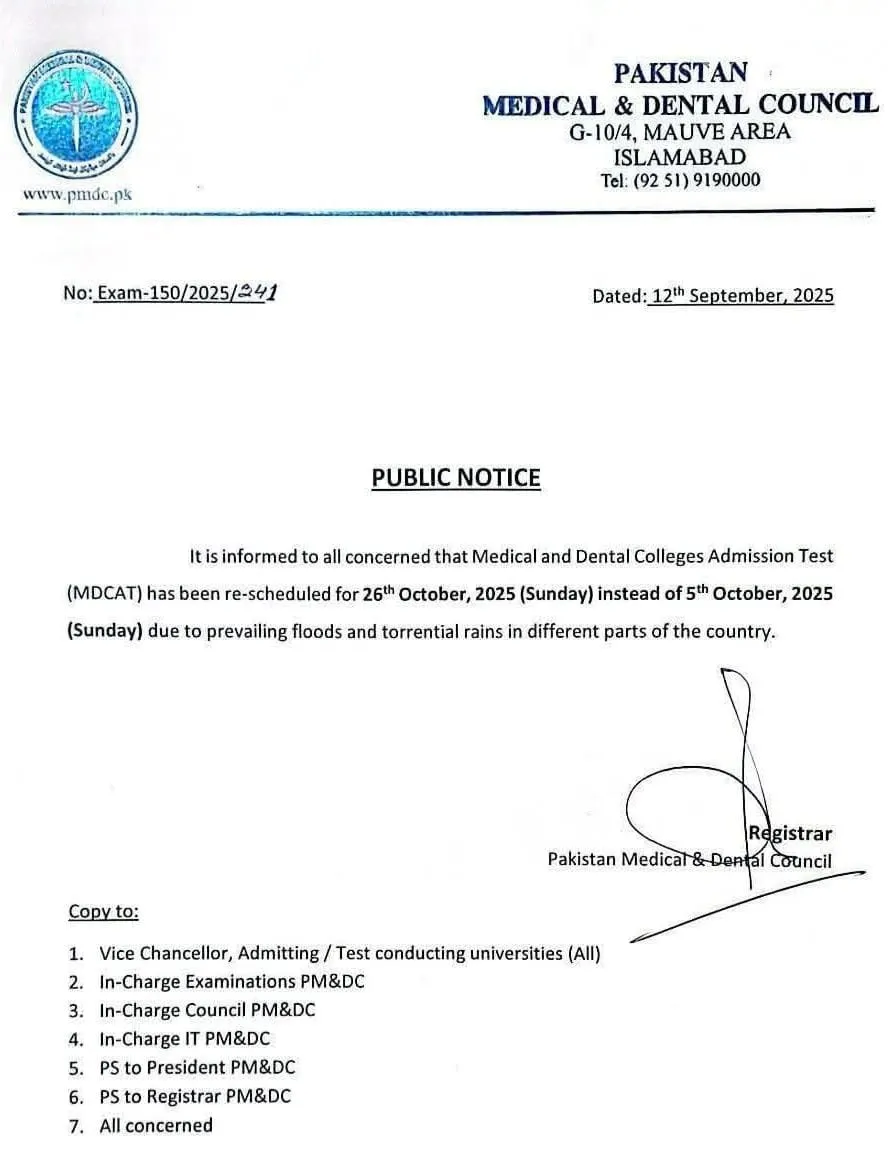 وا ضح رہے کہ ایم ڈی کیٹ پہلے 5 اکتوبر 2025 کو منعقد ہونا تھا تاہم ری شیڈول کے بعد ٹیسٹ اب26 اکتوبر2025 بروز اتوار کو ہوگا۔