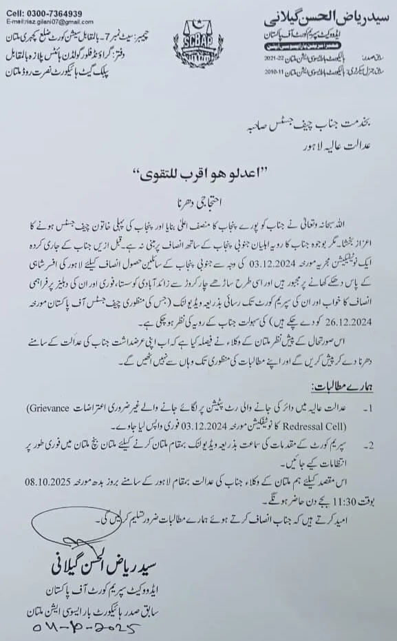 اس مقصد کیلئے ہم ملتان کے وکلاء چیف جسٹس کی عدالت بمقام لاہور کے سامنے بروز بدھ مورخہ08.10.2025 بوقت 11:30 بجے دن حاضر ہونگے۔امید کرتے ہیں کہ جناب انصاف کرتے ہوئے ہمارے مطالبات ضرور تسلیم کر لیں گی۔