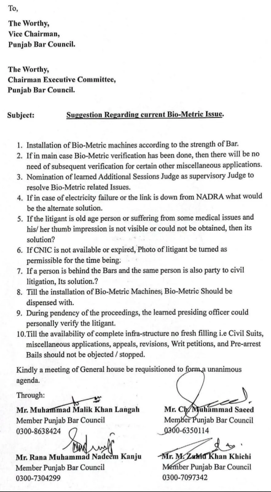 ممبران پنجاب بار کونسل کی جانب سے دی گئی ریکوزیشن میں‌کہا گیا ہے کہ ہر بار ایسوسی ایشن کے ممبران کے تناسب کے مطابق بائیو میٹرک مشینیں نصب کی جائیں۔اگر مرکزی کیس میں بائیو میٹرک تصدیق ہو چکی ہے تو دیگر متفرق درخواستوں کے لیے دوبارہ تصدیق کی ضرورت نہیں‌ ہونی چاہیے۔