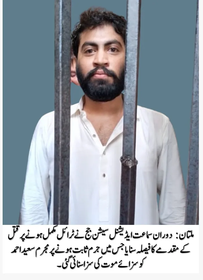 ملتان: سیشن کورٹ ملتان نے قتل و اقدام قتل کے مقدمہ میں مجرم سعید احمد قریشی عرف کاکا ولد رئیس احمد کو جرم ثابت ہونے پر سزائے موت کی سزا سنا دی.