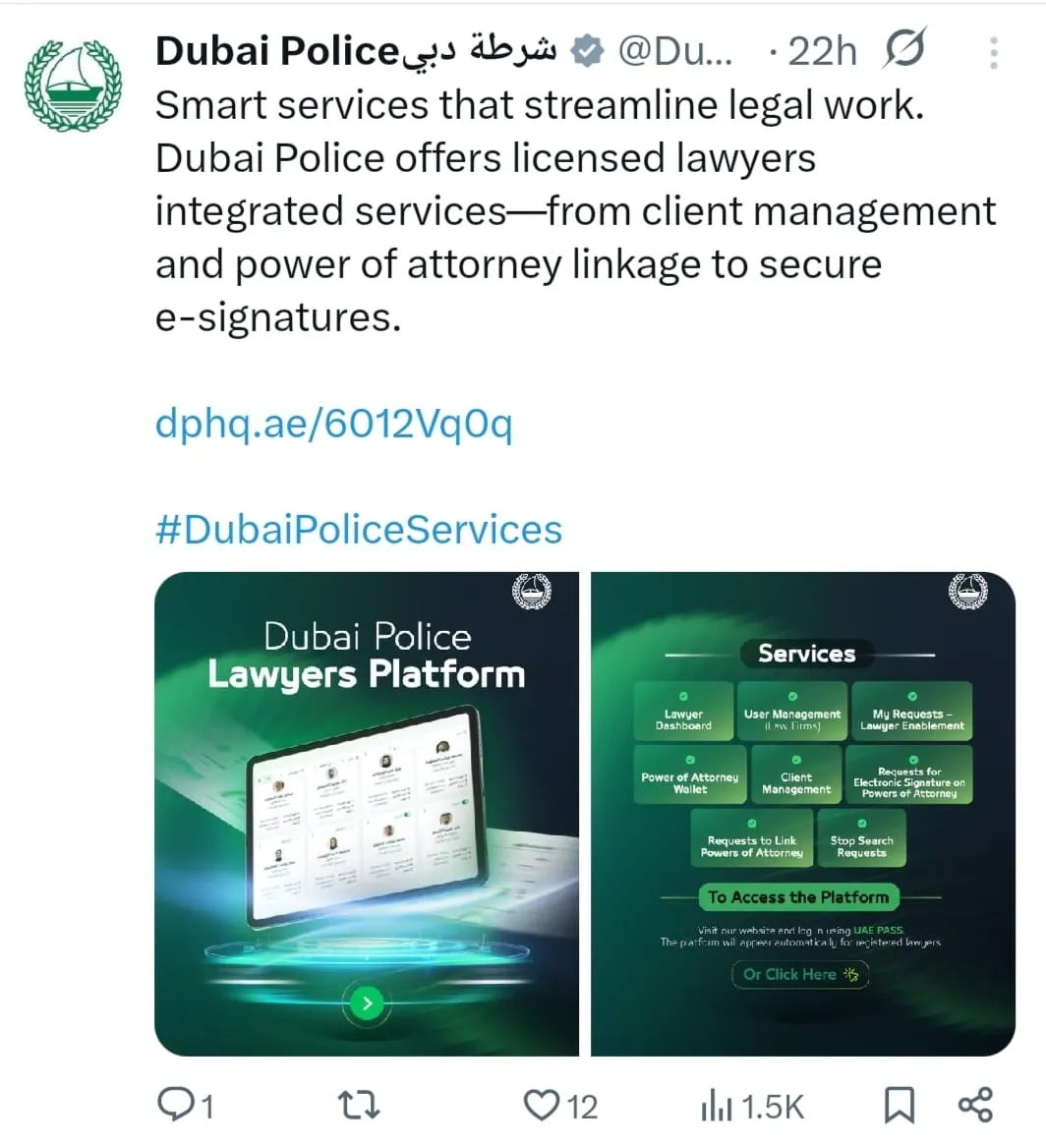 ویب نیوز:دبئی میں قانونی کارروائیوں کو مزید آسان بنانے کیلئے دبئی پولیس نے وکلاء کے لیے ایک نیا ڈیجیٹل پلیٹ فارم متعارف کرادیا۔