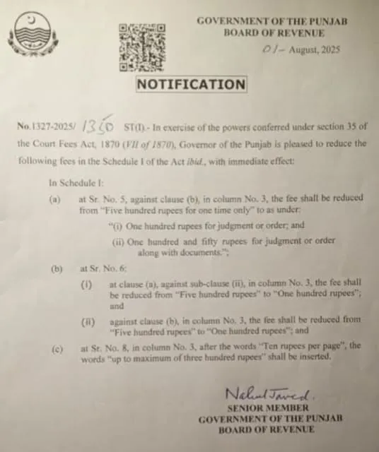 تاہم گزشتہ روز پنجاب حکومت کے بورڈ آف ریونیو کی جانب سے یکم اگست 2025ء کے جاری کردہ ایک نوٹیفکیشن کے مطابق عدالتوں میں مختلف اقسام کی فیسوں میں نمایاں کمی کر دی گئی ہے۔ یہ فیصلہ Court Fees Act, 1870 کے تحت کیا گیا ہے اور اس پر فوری طور پر عملدرآمد ہوگا۔