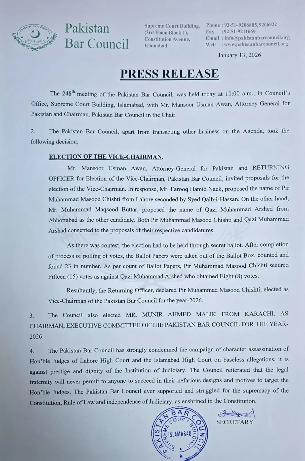 پاکستان بار کے جاری اعلامیے کے مطابق محمد مسعود چشتی کو 2026 کیلئے پاکستان بار کونسل کا وائس چیئرمین اورمنیراحمد ملک کو چیئرمین ایگزیکٹو کمیٹی پاکستان بار کونسل منتخب کر لیا گیا۔