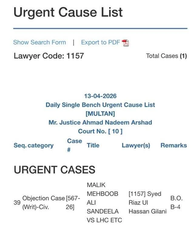 جسٹس احمد ندیم ارشد درخواست کی بطور اعتراض کیس سماعت کریں‌گے.یہ درخواست ڈسٹرکٹ بار ایسوسی ایشن ملتان کے سابق صدر ملک محبوب سندیلہ ایڈووکیٹ نے سید ریاض الحسن گیلانی ایڈووکیٹ اور وسیم اکرم ڈوگر ایڈووکیٹ کے توسط سے دائر کی ہے۔WhatsApp Image 2026 04 12 at 07.30.52
