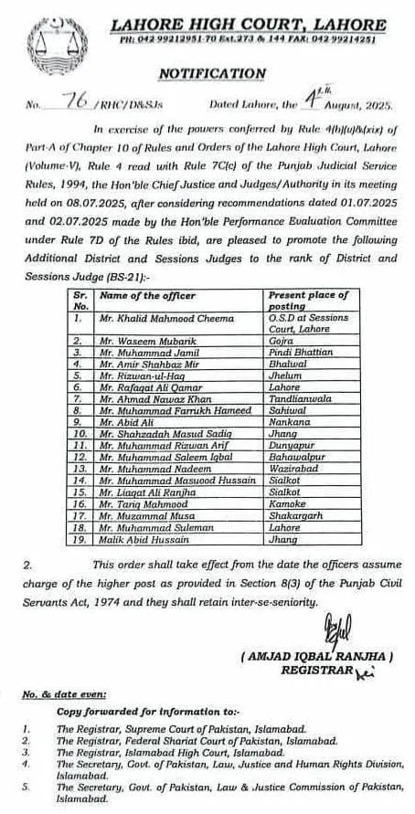 لاہور: ہائیکورٹ لاہور نے صوبہ بھر میں سے 19 ایڈیشنل ڈسٹرکٹ اینڈ سیشن ججز کو گریڈ 21 میںڈسٹرکٹ اینڈسیشن جج کے عہدے پر ترقی دے دی ہے.