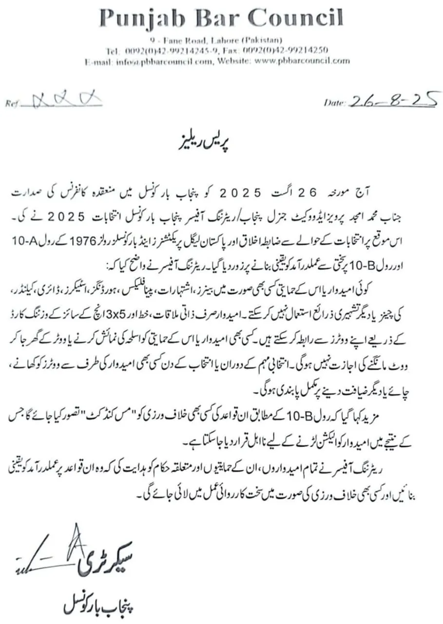 اس موقع پر انتخابات کے حوالے سے ضابطہ اخلاق اور پاکستان لیگل پریکٹشنر ز اینڈ بار کونسلر رولز 1976ء کے رول 10- اے اور رول 10- بی پرسختی سے عملدرآمد کو یقینی بنانے پر زور دیا گیا۔