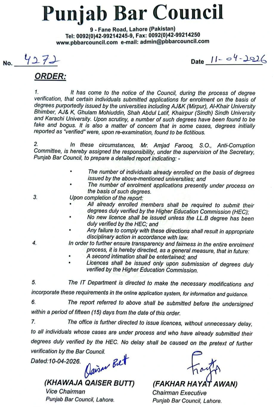 پنجاب بار کونسل کے وائس چیئرمین خواجہ قیصر بٹ اور چیئرمین ایگزیکٹو کمیٹی فخر حیات اعوان کی جانب سے جاری حکم میں جعلی ڈگریوں کے ذریعے وکالت نامہ حاصل کرنے والے افراد کے خلاف کارروائی کا آغاز کرنے کا کہا گیا ہے۔