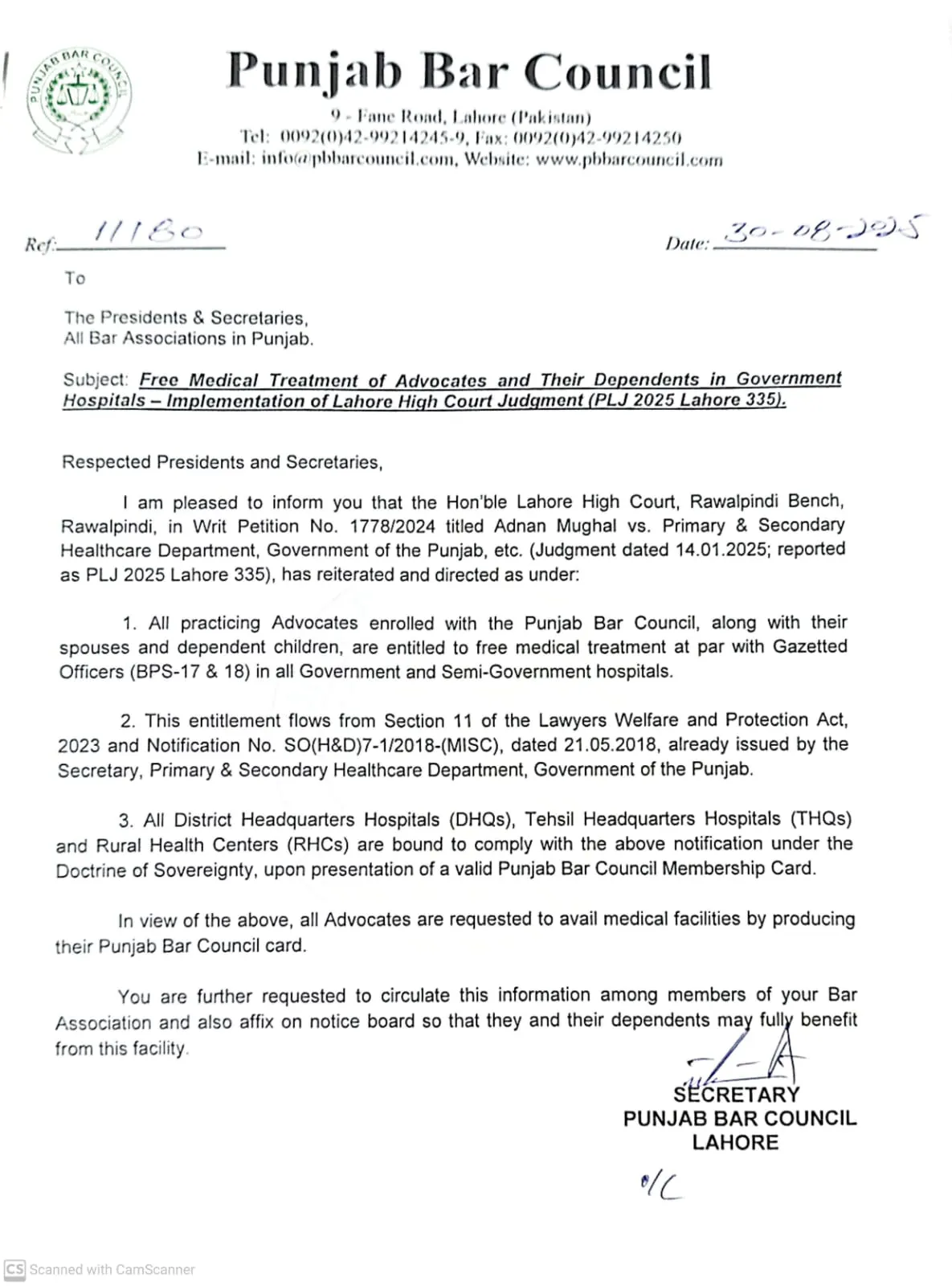 تمام ڈسٹرکٹ ہیڈ کوارٹرز ہسپتال (DHQs)، تحصیل ہیڈ کوارٹرز ہسپتال (THQs) اور رورل ہیلتھ سینٹرز (RHCs) خودمختاری کے نظریے کے تحت مذکورہ بالا نوٹیفکیشن کی تعمیل کے پابند ہیں، بشرطیکہ ایک درست پنجاب بار کونسل ممبرشپ کارڈ پیش کیا جائے۔