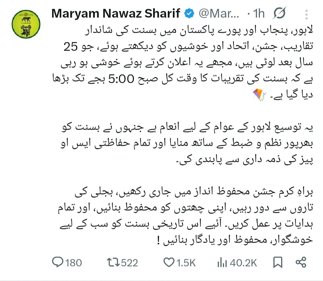 وزیراعلی پنجاب مریم نواز نے اپنے سوشل میڈیا اکاونٹ پر پیغام میں کہا لاہور میں بسنت کی شاندار تقاریب،جشن، اتحاد اورخوشیوں کو دیکھتے ہوئے تقریبات کا وقت صبح 5 بجے تک بڑھا دیا ہے.