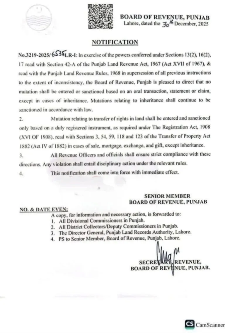 بورڈ آف ریونیو نے احکامات دیئے کہ زمین کے حقوق کی منتقلی، بشمول فروخت، رہن، تبادلہ، اور ہبہ ایک ایسی دستاویز پر مبنی ہونی چاہیے جو دی رجسٹریشن ایکٹ 1908ءاور دی ٹرانسفر آف پراپرٹی ایکٹ 1882ءکے تحت باقاعدہ رجسٹرڈ ہو ۔