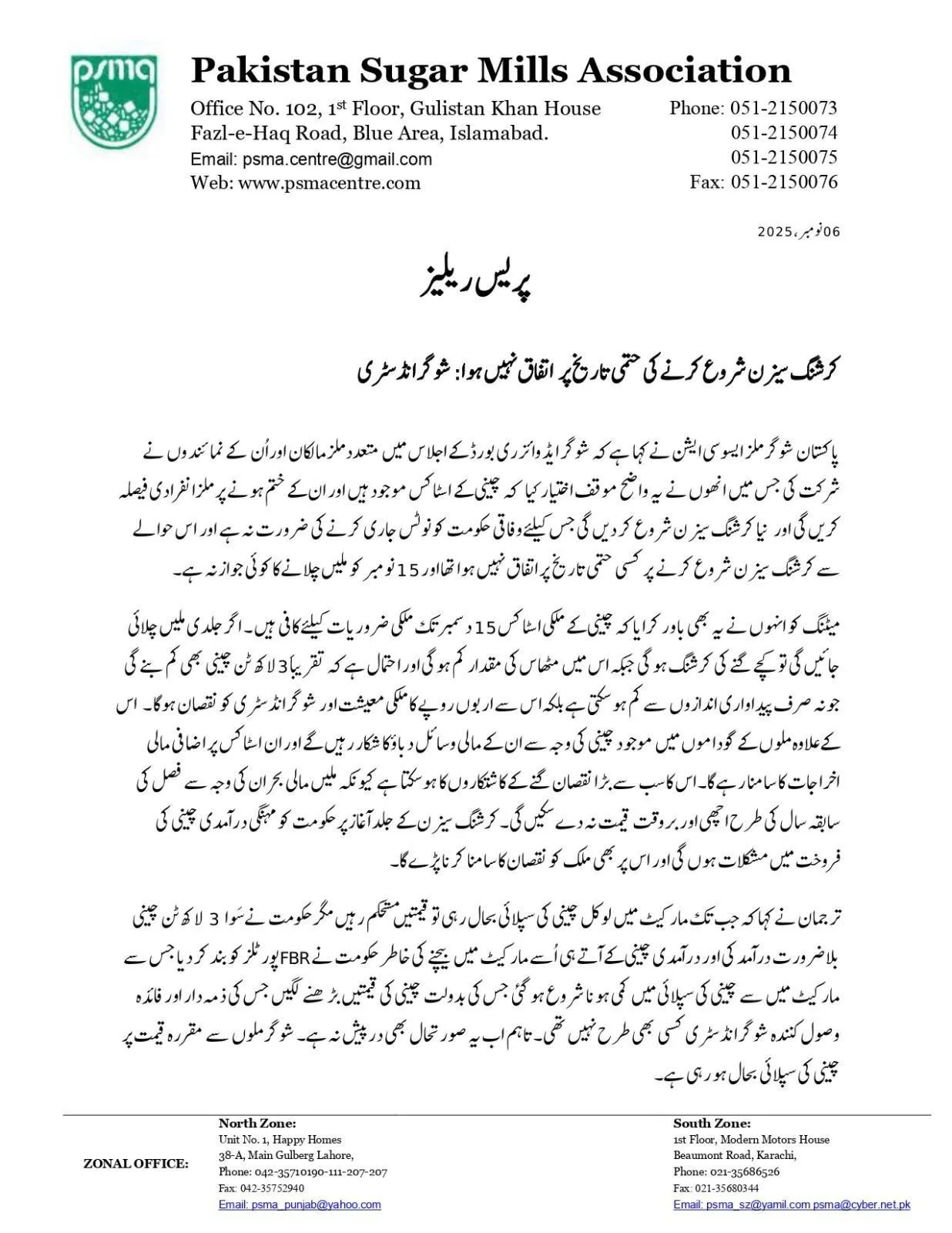 اسلام آباد: پاکستان شوگر ملز ایسوسی ایشن نے کہا ہے کہ شوگر ایڈوائزری بورڈ کے اجلاس میں متعدد ملز مالکان اور اُن کے نمائندوں نے شرکت کی جس میں انھوں نے یہ واضح مؤقف اختیار کیا کہ چینی کے سٹاکس موجود ہیں اور ان کے ختم ہونے پر ملز انفرادی فیصلہ کریں گی اور نیا کرشنگ سیزن شروع کر دیں گی جس کیلئے وفاقی حکومت کو نوٹس جاری کرنے کی ضرورت نہ ہے اور اس حوالے سے کرشنگ سیزن شروع کرنے پر کسی حتمی تاریخ پر اتفاق نہیں ہوا تھا اور 15 نومبر کو ملیں چلانے کا کوئی جواز نہ ہے۔