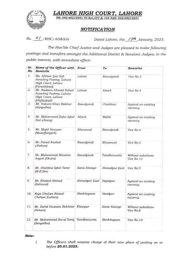 چیف جسٹس لاہور ہائیکورٹ نے صوبہ بھرکے 12 ایڈیشنل ڈسٹرکٹ اینڈ سیشن ججز کے تبدیل کرنے کے احکامات جاری کردئیے ہیں. WhatsApp Image 2025 01 18 at 06.59.53